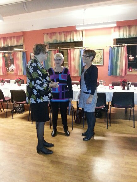 Foto: Til venstre i bildet står klubbleder Kirsti Olafson Pedersen som overrekker Lions nål til Jorunn Nilsen til høyre. I midten står Rosel Olsen som fadder.